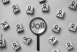 Red job wording inside of magnifier glass surrounding with persons icon for job recruitment and human development concept.