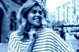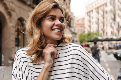 Charming fair-haired woiman lookking away and smilig staying on the street. Caucasian blonde keep hand on chin. Concept leisure of life