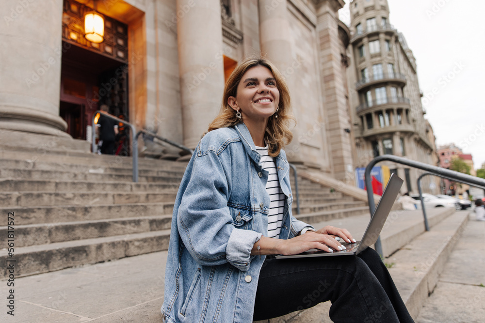 Pretty happy caucasian woman looking away using laptop and holding on legs. Wearing casual clothes have chat, sitting outdoors. Lifestyle, technology concept