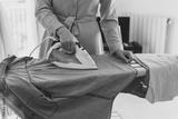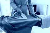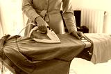 Woman in a yellow dress is ironing clothes.