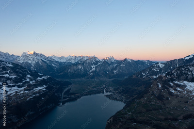 Great drone photo in the Swiss Alps over a lake called Walensee and in the background the peaks of the mountains are lit up by the morning sun.