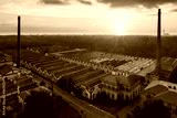 Aerial view of historic worker village of Crespi d'Adda during sunset, Lombardy, Italy