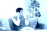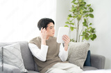 手鏡を持って髪の毛の生え際を確認する男性