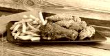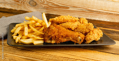 Breaded Fried Chicken Wings, Fingers and Drumsticks on Wooden Rustic Background Side View