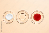Cosmetic textures close-up on a plain background top view. Cream, lotion, hyaluronic acid, peptide samples.