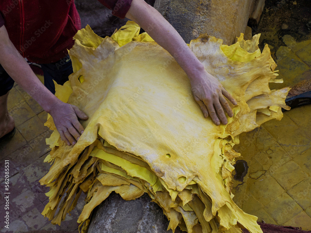 Fes, Morocco, Tannery aerial view Africa Old tanks of the Fez's tanneries with color paint for leather