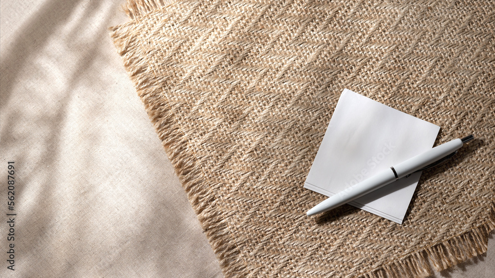 Blank paper sheet card with mockup copy space and floral sunlight shadows on beige background. Flat lay, top view minimal business brand template