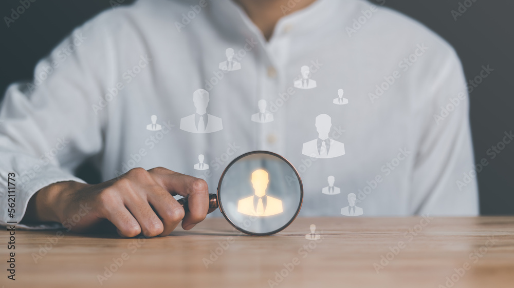 HRM ,Human Resource Management ,Strategic planning for success through people business development concept by choosing professional leaders employee competency Teamwork,man holding a magnifying glass