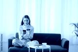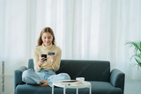 Young asian woman holding credit card in hand paying electronic money in online internet remote shopping store at home on sofa.