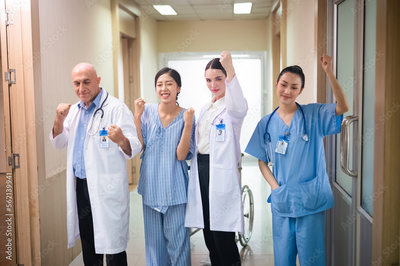 Team doctor nurse happy in hospital background, health insurance life insurance concept