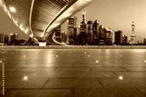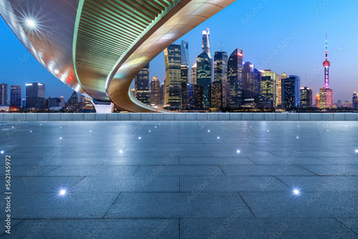 Asphalt road and bridge with city skyline at night in Shanghai, China.