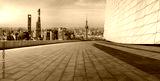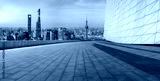 Empty square floor and city skyline with modern buildings at sunrise in Shanghai, China. High Angle view.