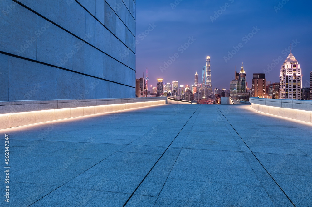 Empty square floor and wall with city skyline at sunset in Shanghai, China.