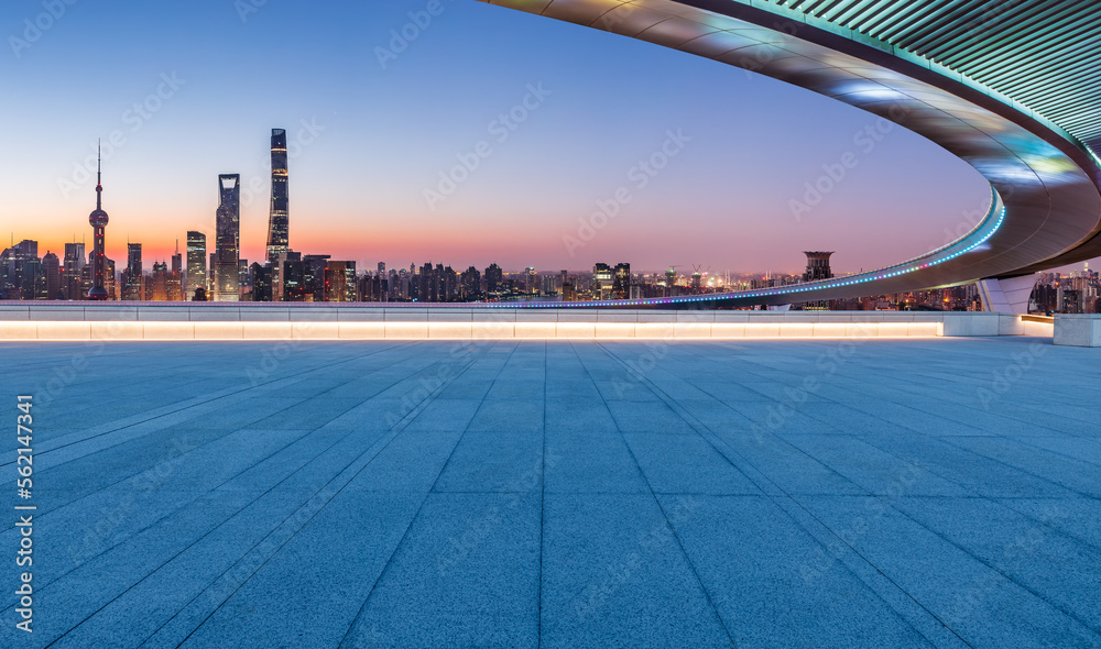 Empty square floor and bridge with city skyline at sunrise in Shanghai, China.
