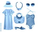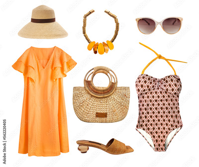 Beautiful yellow brown clothes set. Vocation style garment. Women's clothing summer collection isolated. Female apparel.
