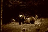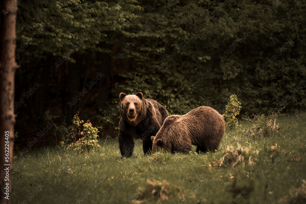 Male and female brown bears ( ursus arctos ) during rut in autumn colorful nature near forest.Wild Slovakia,useful for magazines