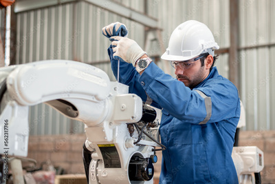 Engineer factory industry wearing safety uniform work and checking system of the welding robots for welding steel electrical control system by laptop robot automate for industry manufacture concept.