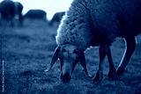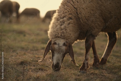 Beautiful, domestic sheep in a large field, lambs graze near the river, a beautiful view.