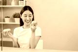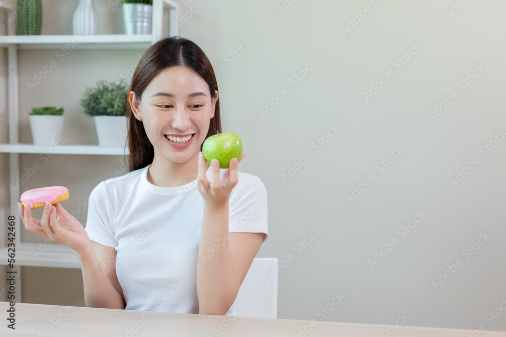 Beautiful asian female smiling holding apple and donut choosing healthy eat. healthy food choices. Girl keep their diet. Diet healthy food concept.