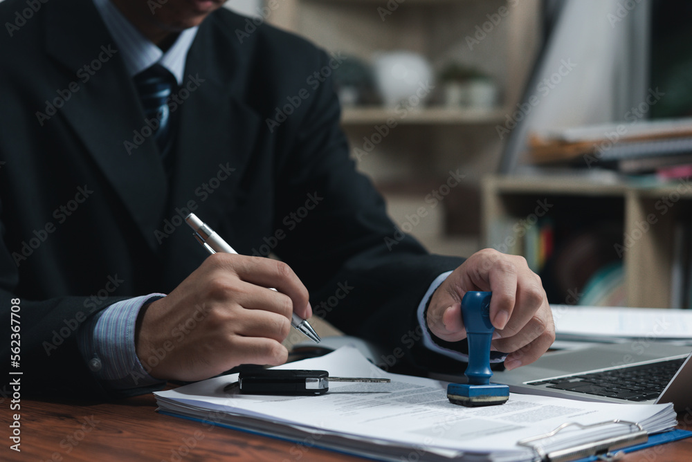 Businessman signing a contract for buying of selling a car.Car rental service. insurance, and contract agreement concepts