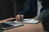 Businessperson reading and writing on book.education studying knowledge development and cognition learning concept.