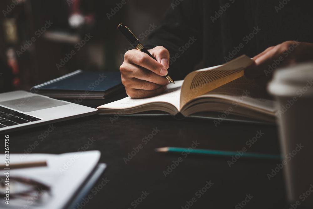 Businessperson reading and writing on book.education studying knowledge development and cognition learning concept.