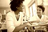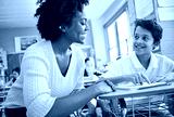 Education, learning and teacher help student with assignment in elementary school. Classroom support, scholarship and happy black woman or educator aid, explaining and helping boy learner in class.