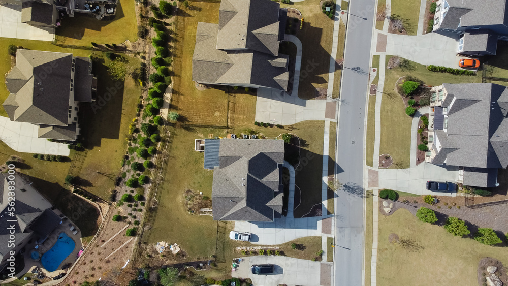90 degree aerial view of brand new two story house with swimming pool and well trimmed yards, front garage in suburban residential neighborhood Flowery Branch, Georgia, US