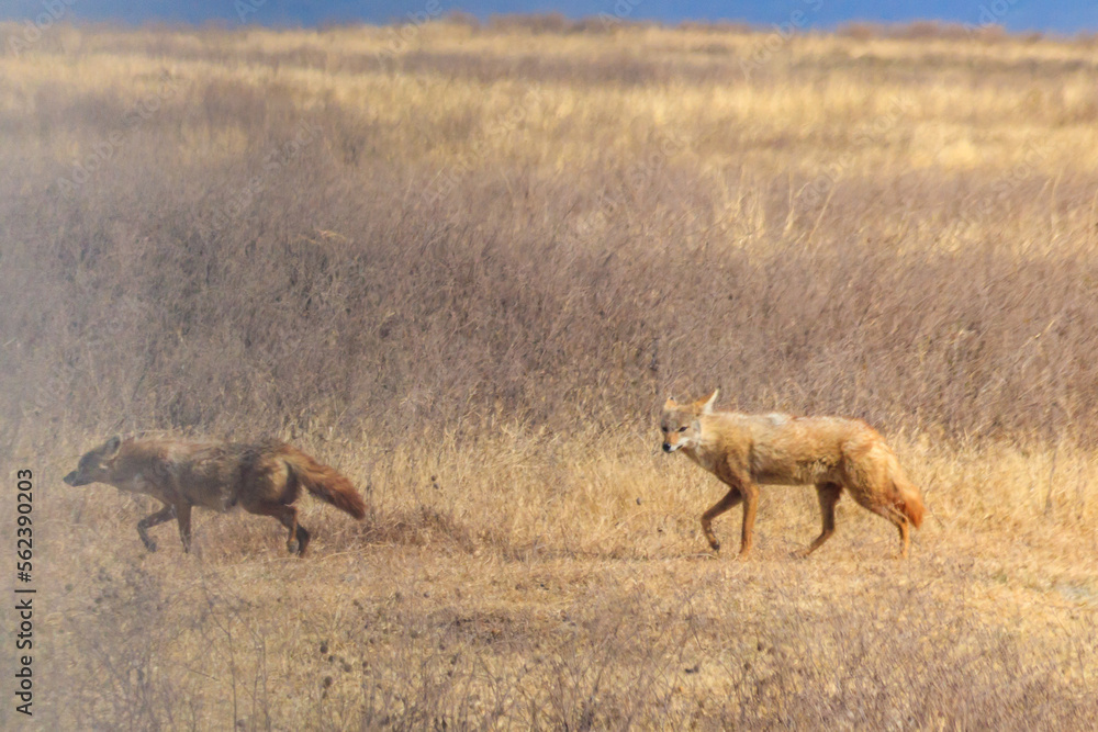 Two jackals walking in dry savannah in Ngorongoro crater national park, Tanzania
