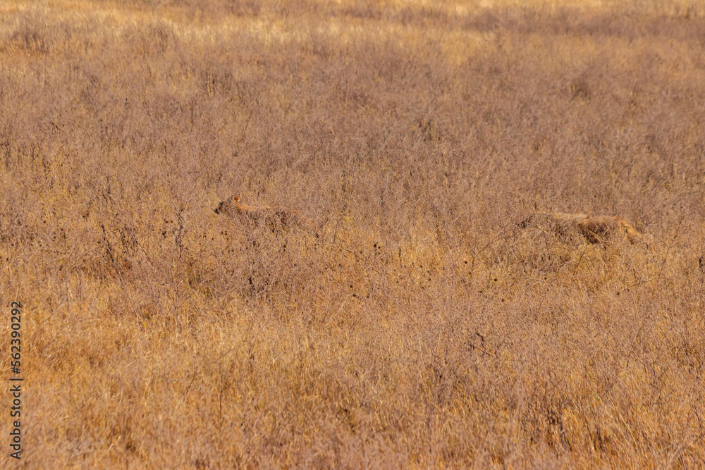 Two jackals walking in dry savannah in Ngorongoro crater national park, Tanzania