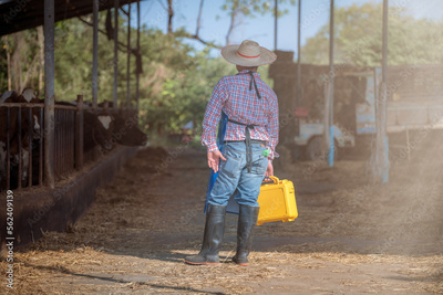 Farmer farm barn adding food for animals healthy dairy cows feeding on fodder standing in row of stables this is farming business concept.