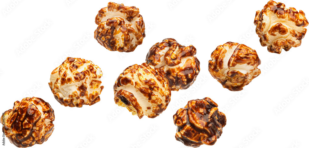 Falling caramel popcorn isolated
