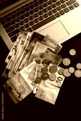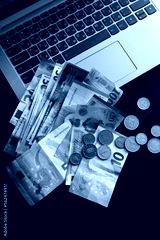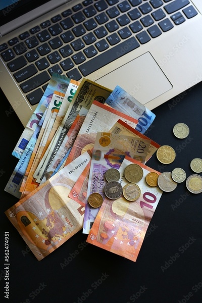 savings money in dollar and euro lie on the table on a dark background. piggy bank