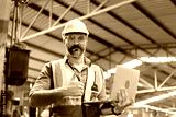 portrait of industrial man man engineer wear uniform and helmet holding laptop show thumb up standing at factory. manager technician manufacturing.