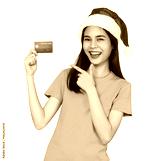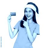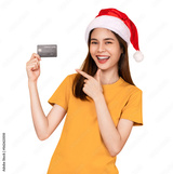 Cheerful beautiful Asian woman wearing red Christmas hat and holding mockup credit card on screen background, PNG transparent.