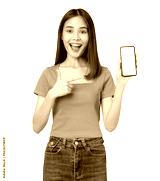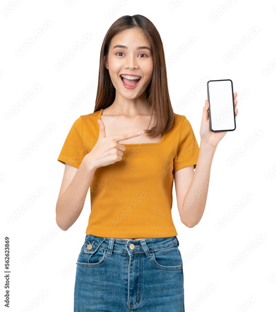 Beautiful Asian woman hand point to smartphone mockup of blank screen and smiling on screen background, PNG transparent.