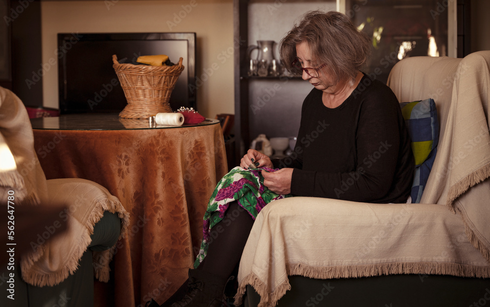 Mature lady sewing clothing in living room