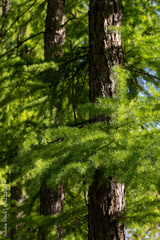 Deciduous forest in spring. Tree trunks and green young foliage in the rays of the setting sun.