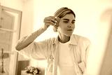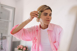 Pretty young caucasian girl dressed pink pajamas and white t-shirt takes face massage with gua sha at home. Calm woman takes care of face indoor. Concept home skin care procedures.