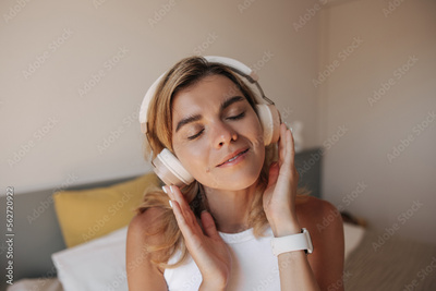 Close-up young caucasian girl enjoying listening to music with closed eyes, sitting on bed in morning. Calm woman wear casual clothes at home. Concept image of life.