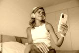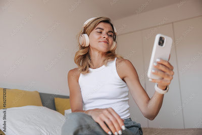 Beautiful young caucasian girl is looking for music on phone to listen to headphones. Calm blonde woman wears casual clothes at home. Conceptual lifestyle.