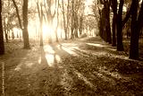 Shades of trees in an alley in a botanical garden. A beech alley in the rays of the setting sun. The concept of peace, relaxation