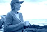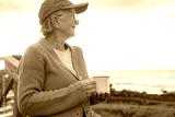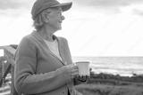Relaxed handsome senior woman with cap and eyeglasses standing outdoor at sunrise holding a cup of coffee or tea. Smiling elderly lady enjoying silence of the morning on the beach