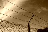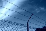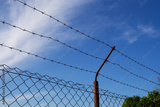 Barbed wire, triple wire, metal band with sharp spikes for fences. Rusty barbed wire against the blue sky. The concept of restricting rights and freedoms.