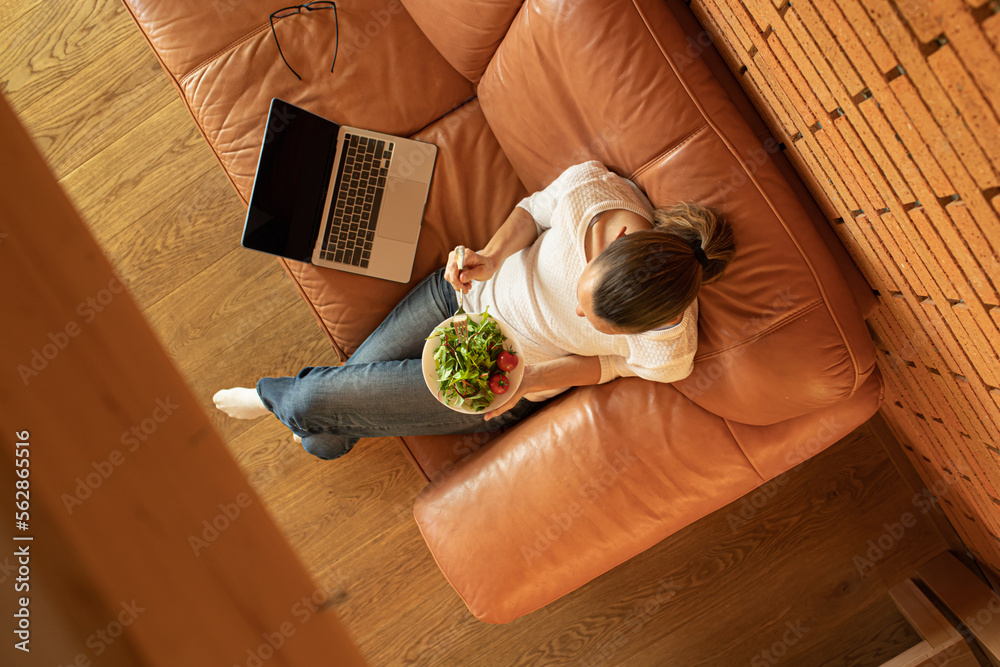 Young woman at home sitting on sofa eating a bowl of salad.