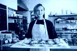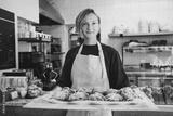 Welcoming female baker holding freshly baked almond croissants in background of bakery shop.
