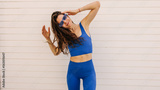 Cute young caucasian girl smiling at camera, waving her hair on light background. Brown hair woman wears dark blue sport suit. Concept lifestyle.