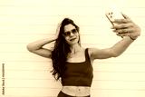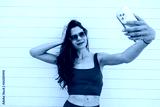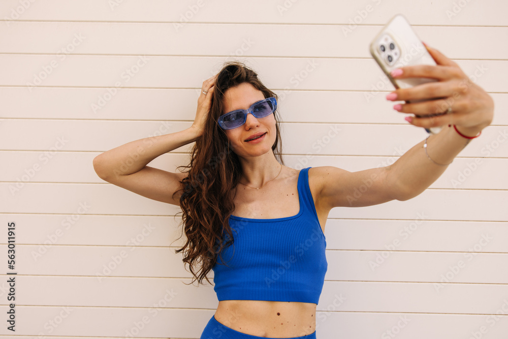Pretty young caucasian woman takes selfie on her smartphone on light background. Brunette wears top and leggins. Concept gadgets, social life.