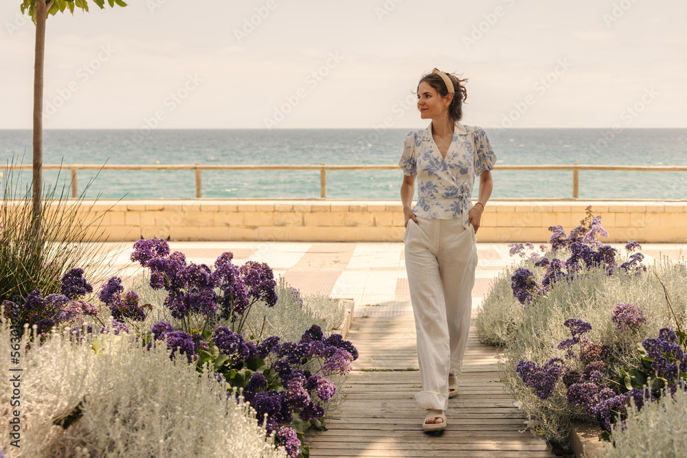 Image beautiful young caucasian woman walking through flower garden against backdrop of sea. Brunette model wears light casual clothes. Concept of relaxing, seaside city.