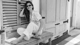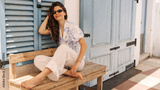 Positive young caucasian woman looking at camera with smile while sits outdoor. Brunette hair girl wears light casual clothes. Concept positive moments.